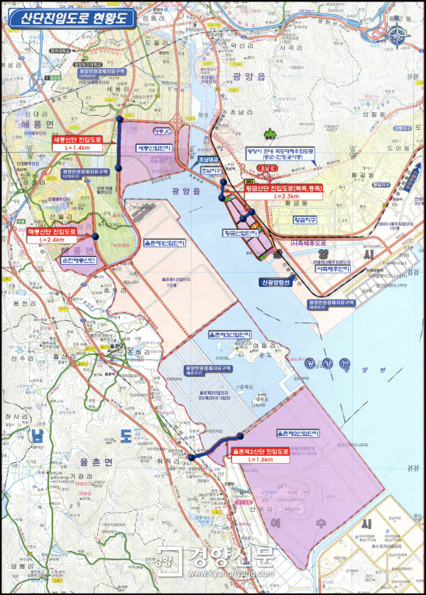 광양경제역청은 광양만권 산업단지 진입도로 사업은 모두 4개 지구에 길이 6.6㎞이며, 소요업비 1028억원을 전액 국비를 지원받아 추진하고 있다고 설명했다.